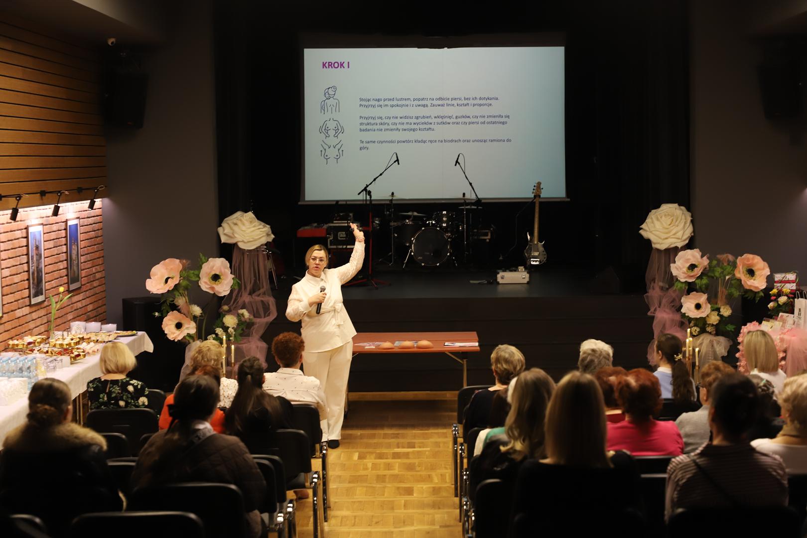 Spotkanie rozpoczęło się o godzinie 13:00 warsztatami poświęconymi zdrowiu i profilaktyce. Uczestniczki miały okazję wysłuchać prelekcji na temat samobadania piersi oraz profilaktyki zdrowotnej. Ekspertka Hanna Wilińska podkreślała, jak ważne jest regularne kontrolowanie swojego zdrowia i zwracanie uwagi na wszelkie niepokojące zmiany. Panie mogły również w praktyce przećwiczyć samobadanie na fantomach, dzięki czemu lepiej poznały zasady prawidłowego wykonywania tego badania.