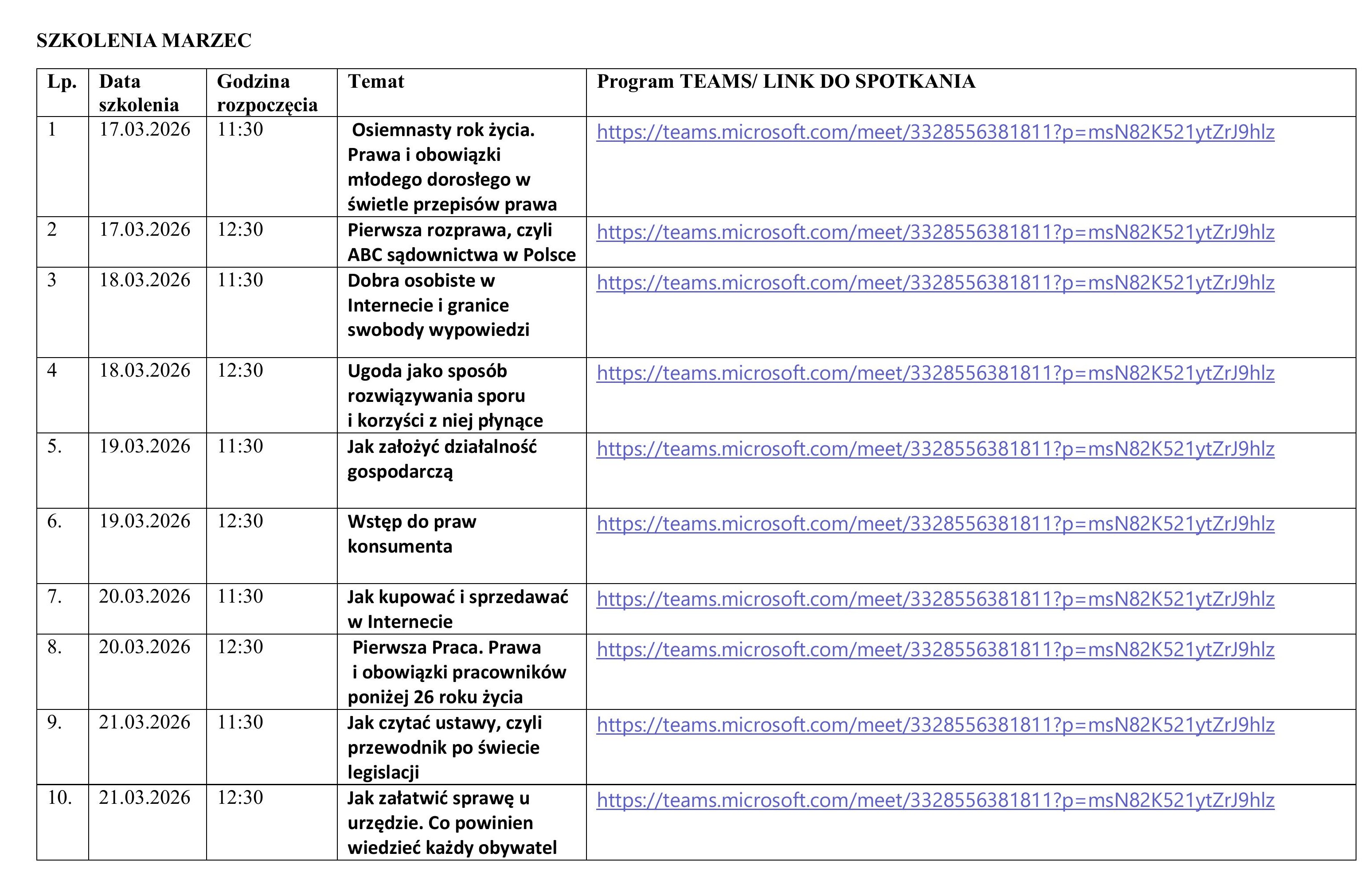 W ramach ww. umowy organizowane są bezpłatne szkolenia z edukacji prawnej. Szkolenia będą odbywały się zdalnie, według tematyki